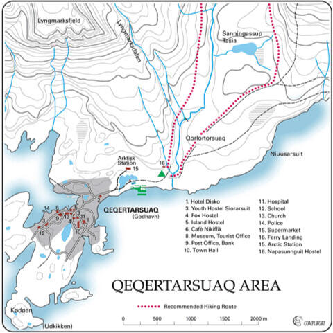 Qeqertarsuaq is a true outlier in the Greenlandic landscape. As the island's only volcanic region, it greets visitors with a surreal blend of black sand beaches dusted in sparkling ice and towering basalt columns that twist into natural art. Above the town’s vibrant houses, reddish-black peaks rise sharply, hiding a backcountry so lush it hosts over half of Greenland’s plant species. For hikers, the area is a masterclass in geology, offering a front-row seat to Disko Bay’s wandering icebergs and its world-class whale watching.